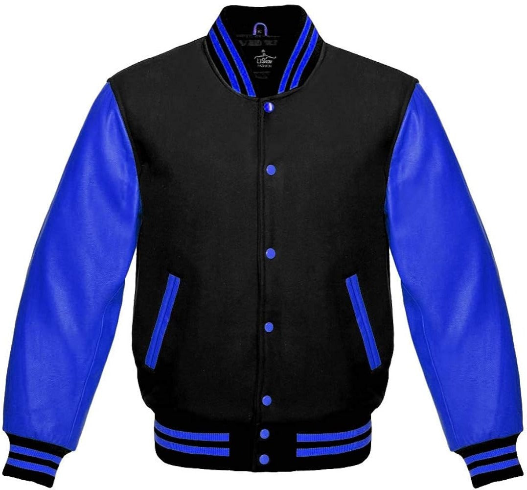 Men’s Black Wool & Royal Blue Real Leather Collar Varsity Jacket Varsity Jacket is crafted...