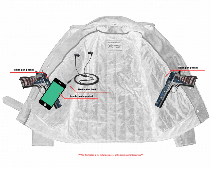 2 inside concealed gun pockets made of special heavy-duty textile with built-in holsters and snap closure.