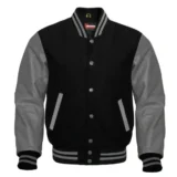 Men Black Wool & Gray Real Leather Varsity Jacket