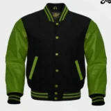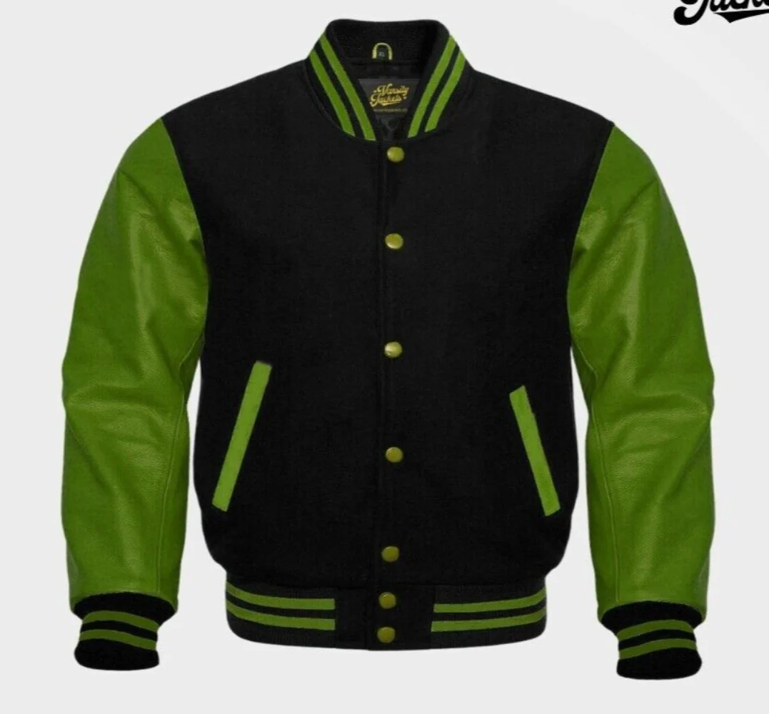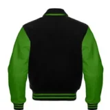Men Black Wool & Green Real Leather Varsity Jacket