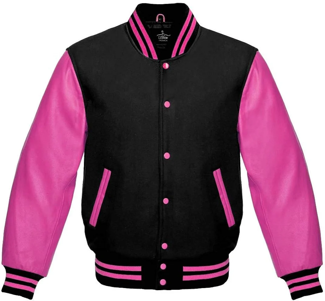 Men’s Black Wool & Light Pink Real Leather Collar Varsity Jacket