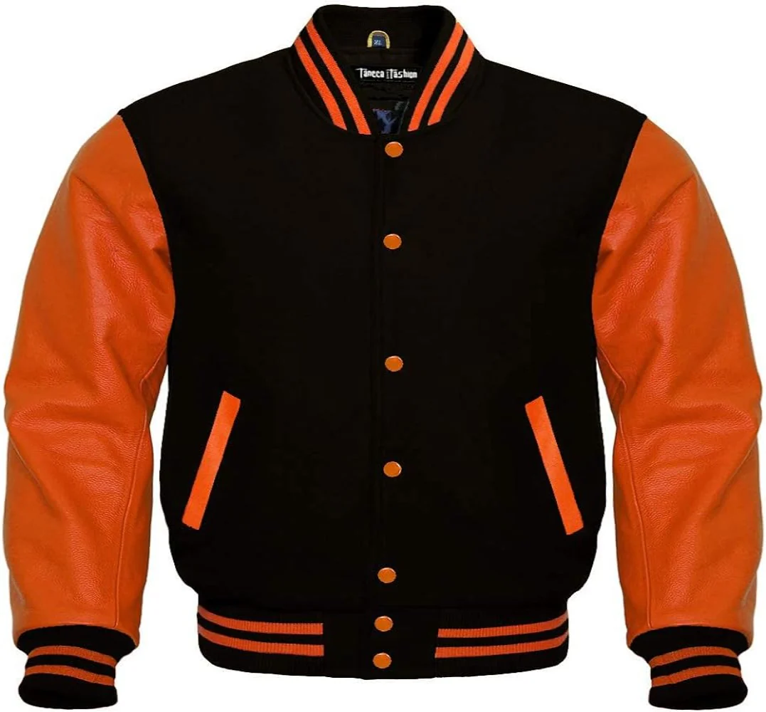 Men’s Black Wool & Orange Real Leather Collar Varsity Jacket