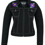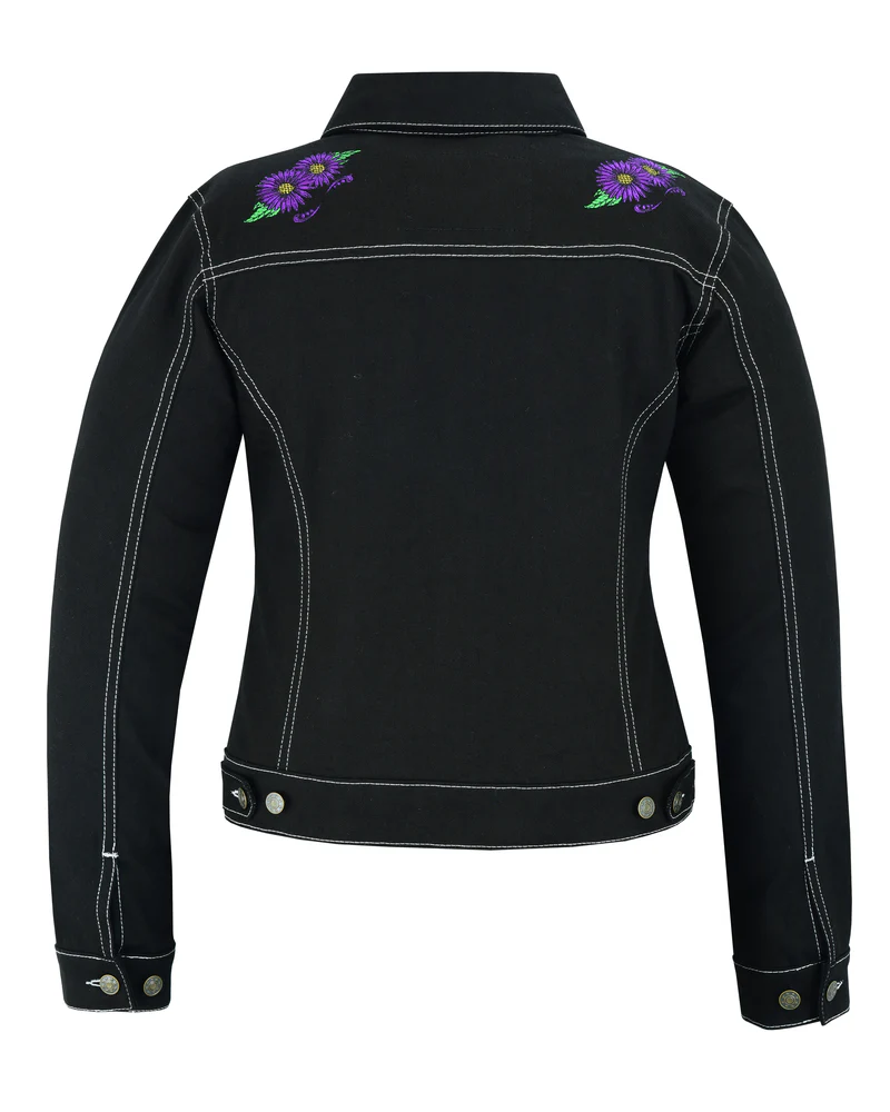 Purple embroidered graphics.