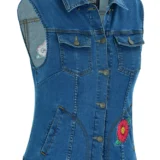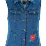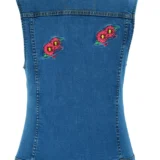 DM944 Women’s Blue Denim Snap Front Vest with Red Daisy