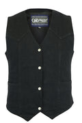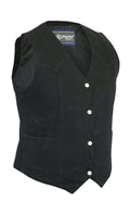 Why choose clothing from Daniel Smart Manufacturing for your next ride? We offer lots of perks, including free shipping on qualifying orders and a simple exchange policy. Place your order for our women's black denim sides motorcycle vest today.