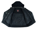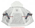Front gun metal zipper hidden under snap-placket blocks wind & rain.