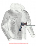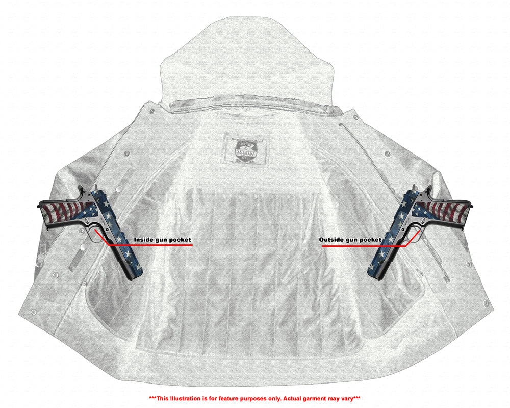 2 upgraded style concealed gun pockets between the snap and the zipper made of special heavy-duty textile with built-in holsters and snap closure.