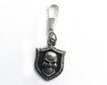 Skull Shield pendant with our distressed pewter wash plating. This pendant has great texture, great weight, feel texture and is 100% made in USA and measures approx. 1"" long by 3/4"" wide.