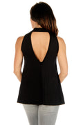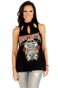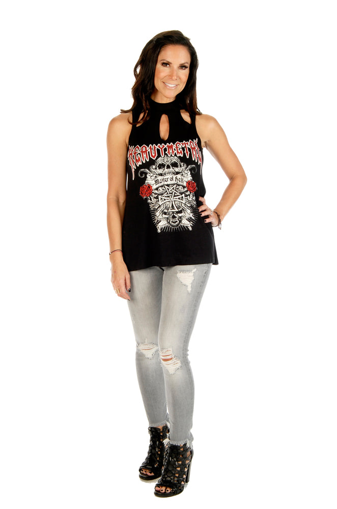 Introducing the Matter of Devilish sleeveless top! The newest addition to our best selling Devilish line. This sleeveless number features a mock neck with a heavy metal embellished graphic, three keyholes and a daring and dramatic open back. Wear this and make them turn around for a second look.