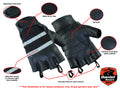 Traditional fingerless glove made in premium drum dyed naked cow, featuring gel palm for long haul comfort, reflective stripes to enhance night time visibility, finger pulls for easy removal, mesh for air flow and an adjustable wrist strap.