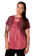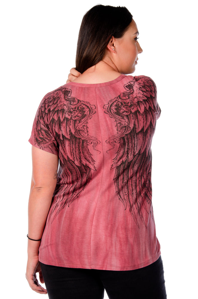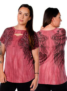 Dare to bare it all in this ultra low slit tee. Adorn with wing graphics and stones, the detail of this top is sure to catch some eyes.