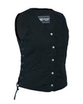 When you buy a vest to wear while you bike, you want it to offer the right amount of protection -- but not at the expense of style. This women's longer-body 3/4 denim biker vest checks all the boxes. It includes an open neck and side laces as well as a single back panel, which you can accessorize with patches, club logos or embroidery.