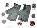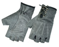 Women's Washed-Out gray goat perforated fingerless glove featuring elastic wrist with grommets and lacing, gel-palm, quick release finger pull tabs and contrast stitching.
