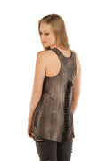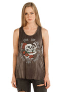 A casual, edgy and cool tank with rhinestone embellishment on the rose and skull graphic. A soft mineral wash makes every individual piece unique and worn. The lace up back also makes an alluring, sexy quality.