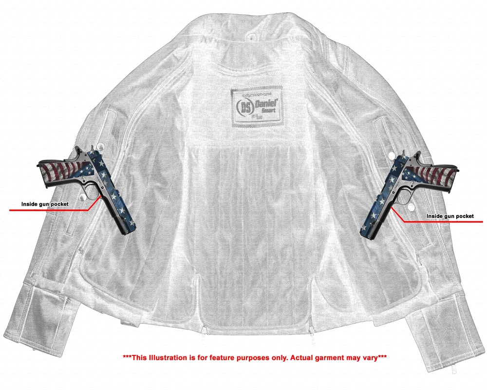 2 inside concealed gun pockets made of special heavy-duty textile with built-in holsters and snap closure.
