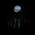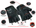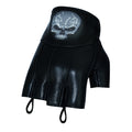 Men's fingerless glove made in premium drum-dyed naked goat leather. Featuring gel palm for long haul comfort, pull-tabs allow for easy removal, an adjustable wrist strapand specially designed skulls to reflect when headlights turn on at night.