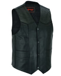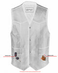 Our vests are made from milled cowhide 1.2 - 1.3mm for durability and comfort. The concealed carry pockets are easy to access and come with built-in holsters with snap closures. The linework, silver buttons, and V-shaped front elevate this vest's design.