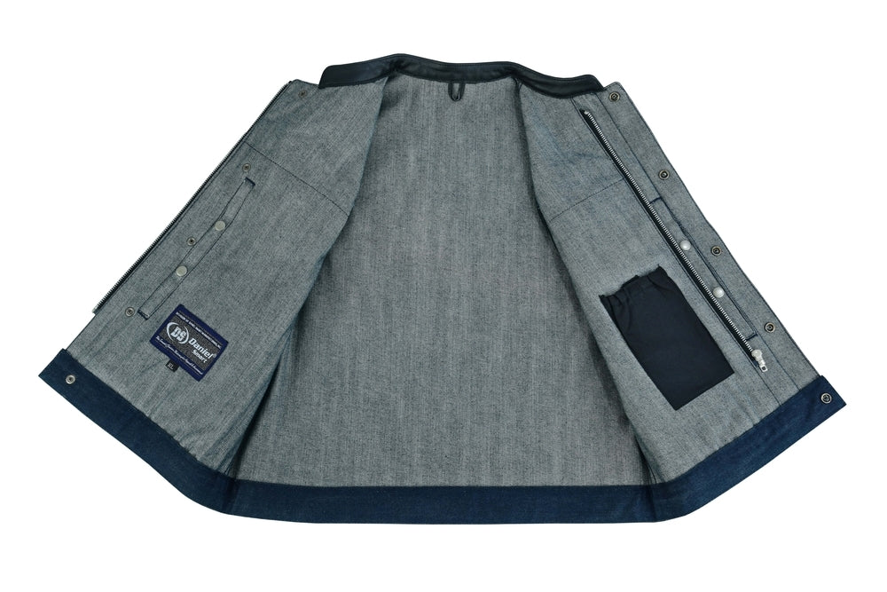 DM964 Women's Broken Blue Rough Rub-Off Raw Finish Denim Vest W/Leath