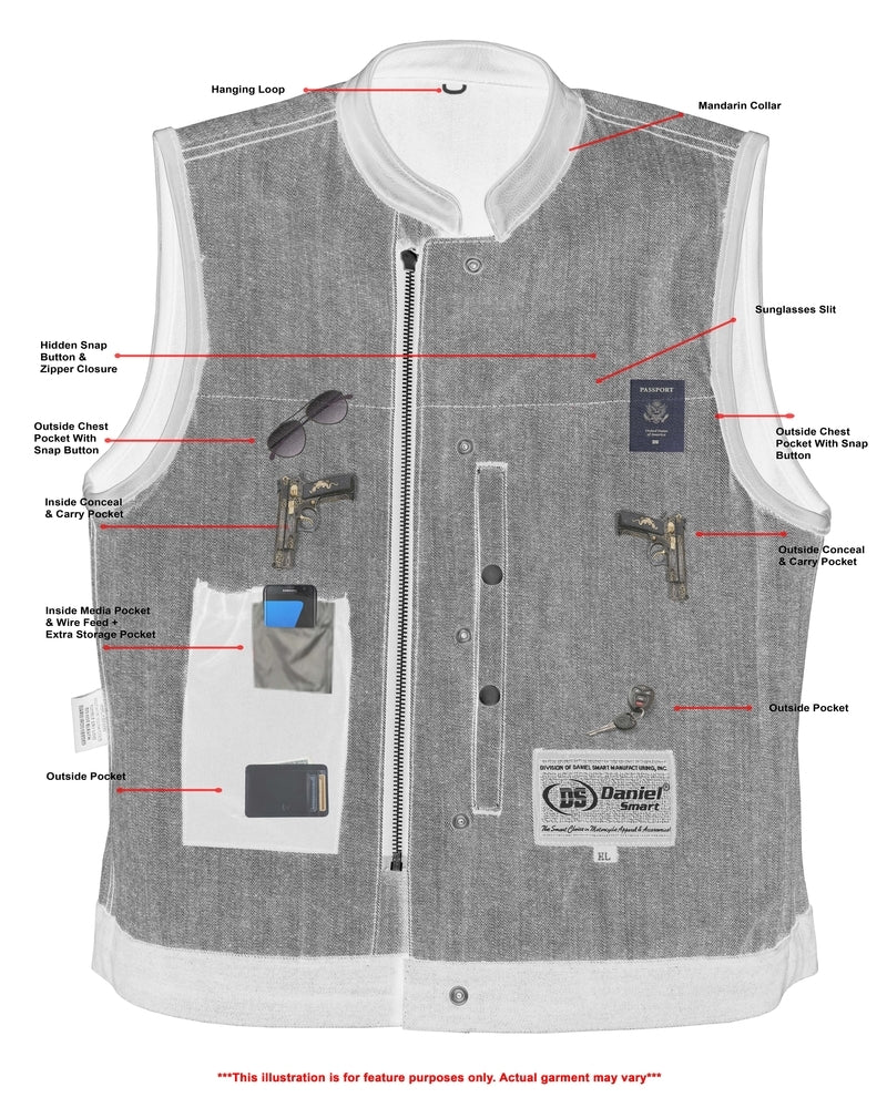 2 upgraded style concealed gun pockets between the snap and the zipper made of special heavy-duty textile with built-in holsters and snap closure.