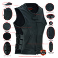 Adjustable triple side straps over heavy spandex side panels for styling and additional size adjustment.