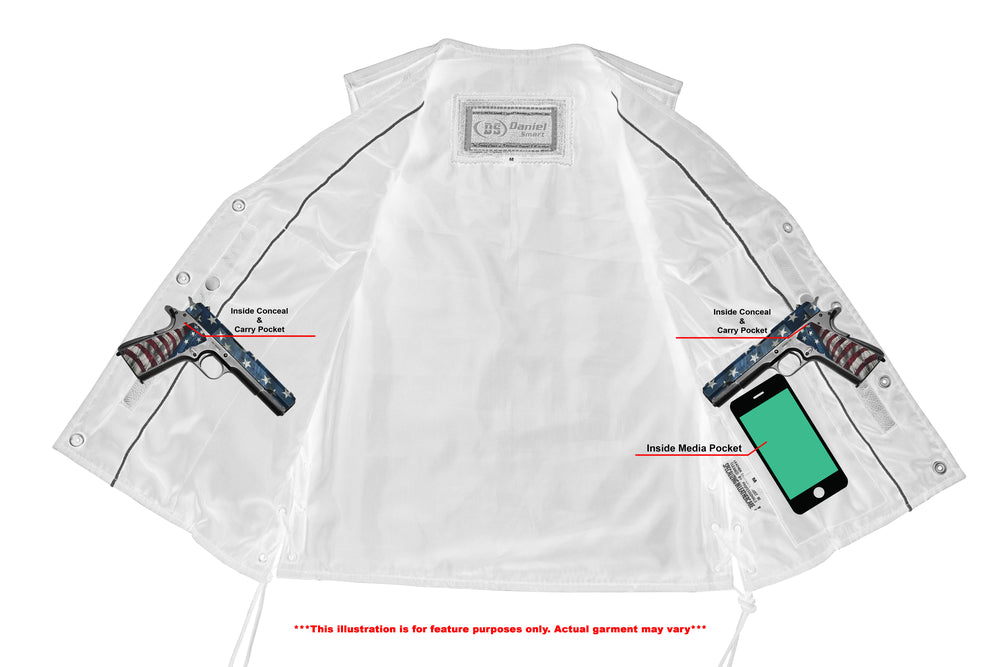 2 inside concealed gun pockets made of special heavy duty textile with built-in holsters and snap closure.