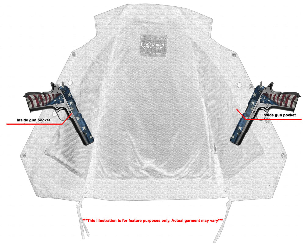2 inside concealed gun pockets made of special heavy-duty textile with built-in holsters and snap closure.