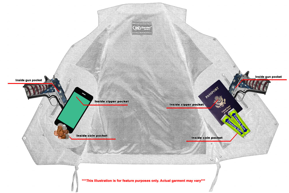 Built in dual side concealed gun pockets with built-in holsters and snap closure.