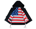 Front gun metal #10 zipper hidden under snap-placket blocks wind & rain.