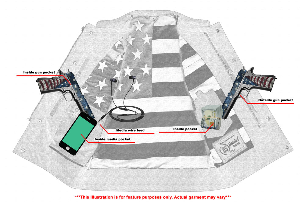 2 upgraded style concealed gun pockets between the snap and the zipper made of special heavy-duty textile with built-in holsters and snap closure.