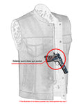 - 2 upgraded style concealed gun pockets between the snap and the zipper made of special heavy-duty textile with built-in holsters and snap closure.
