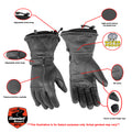 Women's waterproof gauntlet glove featuring high performance insulated liner for extra warmth, reflective piping, gel palm, an adjustable wrist strap. Made in premium Aniline cowhide.