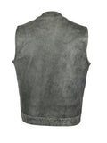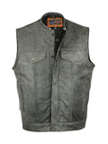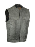 Leather vests are the perfect versatile piece of outerwear. Our men's single panel concealment biker vest without a collar is made from soft, premium drum-dyed gray cowhide 1.2 - 1.3mm. This version has no collar for a sleek look.