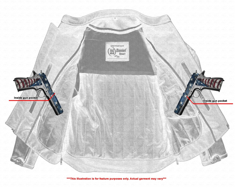 2 inside concealed gun pockets made of special heavy duty textile with built-in holsters and snap closure.